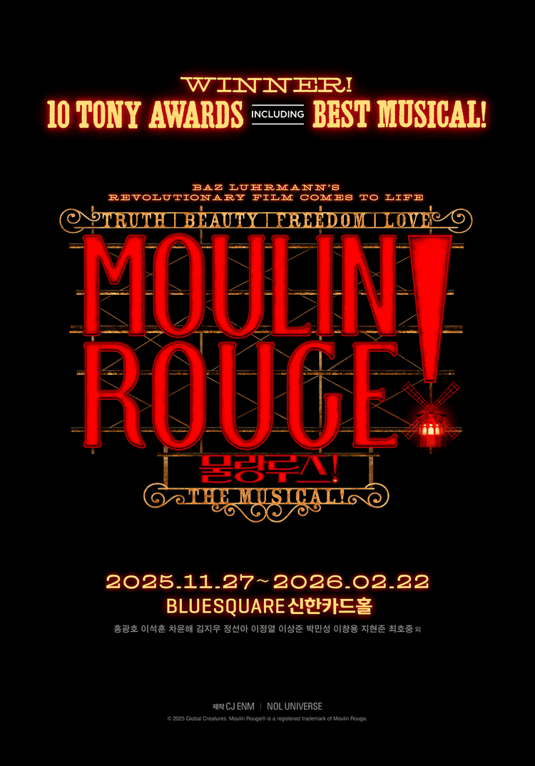 2025년 11월 27일부터 2026년 2월 22일까지, 서울 한남동 블루스퀘어 신한카드홀에서는 전 세계적으로 사랑받아온 뮤지컬「물랑루즈(Moulin Rouge! The Musical)」가 한국 관객과 만납니다. 2001년 바즈 루어만 감독의 동명 영화로 전 세계적인 흥행을 거둔 후, 2019년 브로드웨이 초연을 통해 무대 예술로 재탄생한 「물랑루즈」는 현재까지 토니상 10관왕을 비롯해 수많은 상을 휩쓴 초대형 뮤지컬입니다. 화려한 무대 장치, 강렬한 음악, 그리고 인간의 가장 원초적인 감정을 다룬 서사로 전 세계 팬들을 열광시켜 왔습니다. 이번 서울 공연은 오리지널 프로덕션의 매력을 충실히 담아내며, 동시에 한국 관객에게 맞는 세밀한 연출과 무대 기술이 더해져 새로운 감동을 선사할 예정입니다.